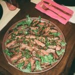 Pour chimichurri over sliced steak, and serve immediately with arugula, lemon, and chimichurri sauce.