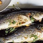 Roasting a whole fish always feels pretty baller to us. Branzino is one of our favorites — it makes us feel like we’re dining on a beach on the Italian coast. Ask your fishmonger to gut and scale the fish.